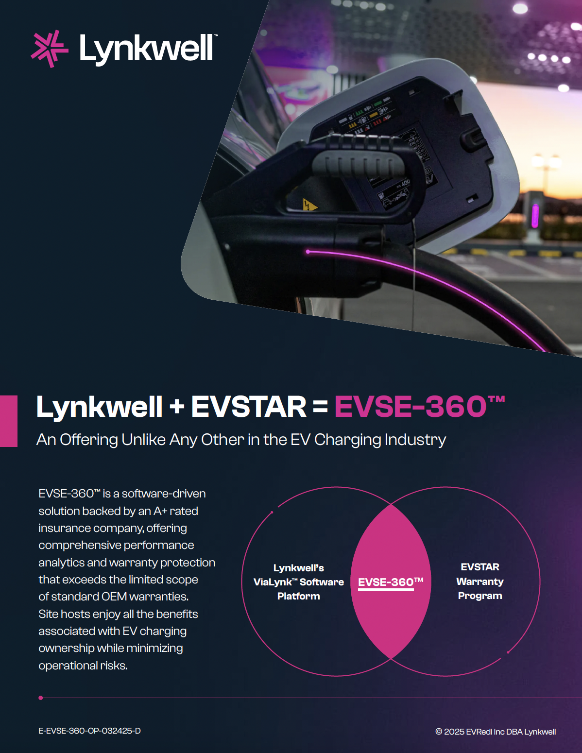A: EVSE-360™ is a comprehensive EV charger protection and performance solution offered by Lynkwell. It combines full-value warranty coverage with integrated analytics software (ViaLynk™) to maximize charger uptime, proactively manage charger health, and reimburse revenue lost due to downtime.
